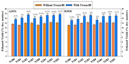 Classic yeast fermentation was performed for bioethanol production using total soluble sugars released from 1% NaOH pretreatment and sequential enzymatic hydrolyses in representative samples (Figure 3). Biochar, in combination with nitrogen fertilizers, significantly improved bioethanol yield (% dry matter) with and without Tween-80. Compared with control, ethanol yield with and without Tween-80 of 13.5–14.6% and 16.5–17.8% were recorded in biochar-applied treatments, respectively. Furthermore, during 2019, bioethanol yield was higher by 24–25% with Tween-80 in biochar-applied treatments compared to non-biochar treatments.