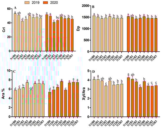 Biochar and nitrogen fertilizer effect on cell wall polymers feature (A) crystalline index (CrI) of cellulose, (B) degree of polymerization of cellulose, (C) arabinose proportion of hemicellulose, (D) ratio of xylose and arabinose. Different letters on bars are not significantly different at p < 0.05. (n = 3).