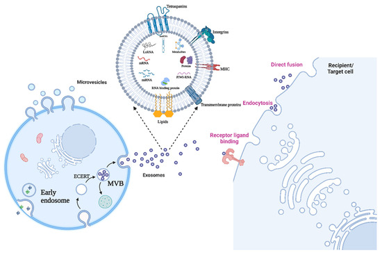 Components of the ESCRTs and proteins implicated in the numerous pathways responsible for exosomes formation, such as the RAB family of proteins, tetraspanins, as well as certain transmembrane proteins, are some of the proteins that are frequently concentrated in exosomes (Figure 1) [60]. The lipid composition of exosomes was discovered to have characteristics with that of the donor cells, with lipids including sphingomyelin, ceramide, cholesterol, and phosphatidylserine being found abundant because of their involvement in exosomes formation [61].