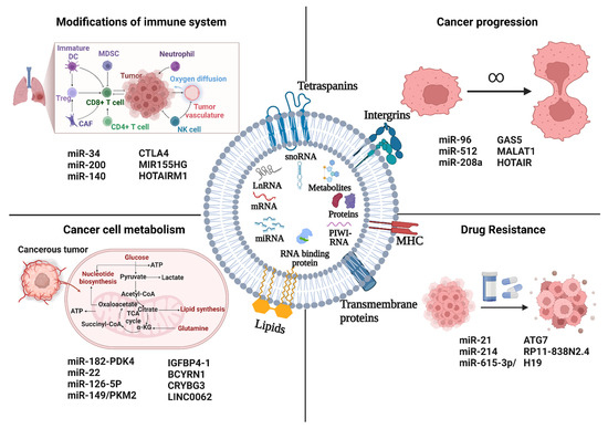 Exosomal ncRNAs have drawn more interest in recent years for their potential implications in the emergence of cancer. Exosomal ncRNAs have a key role in the proliferation, angiogenesis, invasion, metastasis, drug resistance, and immunological regulation of cancer cells, all crucial stages in the evolution of the disease (Figure 2). The involvement of exosomal ncRNAs in various cancer growth pathways will be further discussed in this section.