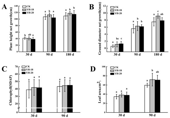 Effects of inoculation with YH-18 and YH-20 on (A) ground diameter growth, (B) height growth, (C) chlorophyll content and (D) leaf area of P. davidiana. Different letters indicate significant differences between different treatments in a group within the same period at a confidence level of p < 0.05.