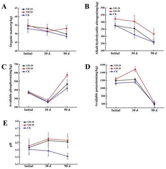 Effects of YH-18 and YH-20 microbial inoculants on (A) OM, (B) AN, (C) AP, (D) AK, and (E) pH in soil.