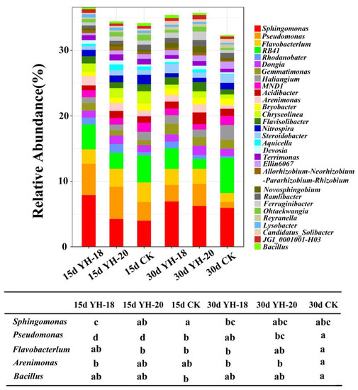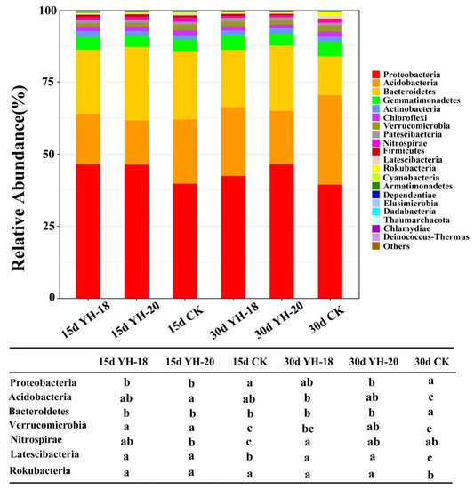 Among these dominant bacteria, compared with the non-inoculated CK, the rhizosphere soil inoculated with YH-18 and YH-20 was significantly enriched in Proteobacteria, whereas Verrucomicrobia, Nitrospirae, and Latescibacteria were significantly reduced 15 days after inoculation. At 30 days, Proteobacteria and Bacteroidetes were significantly enriched, while Acidobacteria, Verrucomicrobia, Latescibacteria, and Rokubacteria were reduced. In the natural succession of the rhizosphere bacterial community of the CK group within 30 days, Bacteroidetes and Nitrospirae decreased significantly, while Acidobacteria, Latescibacteria, and Rokubacteria increased significantly. The application of inoculants slowed the changes in Bacteroidetes, Acidobacteria, Latescibacteria, and Rokubacteria (Figure 3).