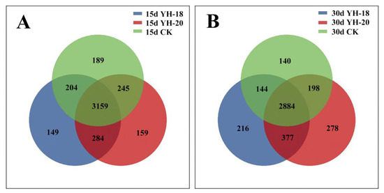 Venn diagram of different combinations: (A) Venn diagram of different treatments 15 days after inoculation. (B) Venn diagram of different treatments 30 days after inoculation.
