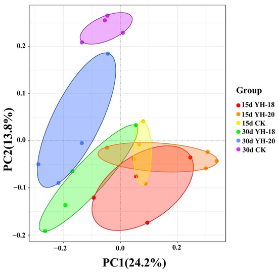Compared with the CK group, the Ace index increased 15 days after the application of the two inoculants, and the Ace and Chao 1 indices increased significantly 30 days after application (p < 0.05). Compared with the CK group, the Shannon index increased 15 days after the application of the YH-20 microbial inoculant and increased 30 days after the application of the two inoculants. The Simpson index showed no difference among the different treatments and different time periods. In the CK group, the Chao1 index at 30 days was significantly lower than that at 15 days (p < 0.05), while the ACE and Shannon indices were slightly lower at 30 days than at 15 days, but the decrease was not significant. In the YH-18 treatment, the ACE, Chao 1, Shannon, and Simpson indices at 30 days after inoculation were not different from those at 15 days after inoculation. In the YH-20 treatment, the ACE, Chao 1, and Simpson indices 30 days after inoculation were not different from those 15 days after inoculation, but the Shannon index 30 days after inoculation was slightly lower than that 15 days after inoculation, although the effect was not significant. The results showed that within 30 days, the diversity and richness of the rhizosphere soil microbial community in the three treatments showed a downward trend, but the inoculation treatment effectively slowed the decline in diversity and richness within 30 days (Table 2).