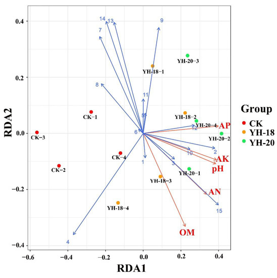 Redundancy analysis of the soil bacterial community composition at the genus level and soil environmental parameters. Soil environmental parameters are represented by red lines and bacterial genera are represented by blue lines (1: Sphingomonas, 2: Pseudomonas, 3: Flavobacterium, 4: RB41, 5: Dongia, 6: Gemmatimonas, 7: Haliangium, 8: MND1, 9: Acidibacter, 10: Arenimonas, 11: Bryobacter, 12: Flavisolibacter, 13: Ellin6067; 14: Steroidobacter, 15: Ferruginibacter).