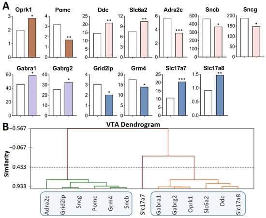 Analysis of the RNA-Seq database of the VTA [45,46] revealed DEGs among genes of interest that participate in the rewarding processes (Figure 1A; Supplementary Table S1).