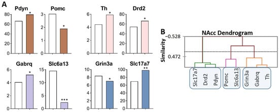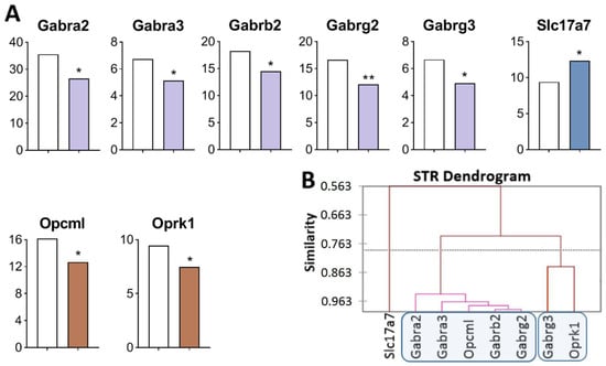 Analysis of the RNA-Seq database of the STR [47] revealed DEGs of interest in this region that participate in rewarding processes (Figure 3A, Supplementary Table S1). Opioidergic genes were downregulated: Opcml (p = 0.034) and Oprk1 (p = 0.042); GABAergic genes encoding GABA receptors were downregulated: Gabra2 (p = 0.024), Gabra3 (p = 0.029), Gabrb2 (p = 0.042), Gabrg2 (p = 0.005), and Gabrg3 (p = 0.049); Glutamatergic transporter gene Slc17a7 was upregulated (p = 0.047).