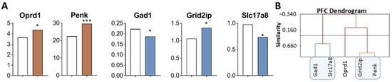 In comparison with the control, opioidergic genes were upregulated (Figure 4A, Supplementary Table S1): Oprd1 (p = 0.028), encoding delta opioid receptors, and Penk (p < 0.001), encoding pentapeptide opioids Met-enkephalin and Leu-enkephalin. Glutamatergic genes: Grid2ip (p = 0.041) encoding glutamate receptor was upregulated, whereas Slc17a8 (p = 0.032) and Gad1 (p = 0.044), encoding glutamate transporter and glutamate decarboxylase, respectively, were downregulated.