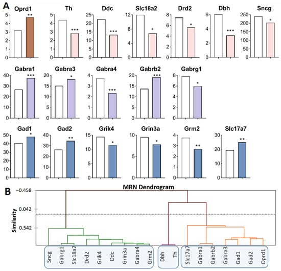 Analysis of the RNA-Seq database of MRNs [48] revealed the largest number of DEGs of interest in this main region processes (Figure 5A, Supplementary Table S1). Opioidergic gene Oprd1 was upregulated (p = 0.009) and CAergic genes were downregulated: Th (p < 0.001; q = 0.035), Ddc (p < 0.001; q = 0.005), Dbh (p < 0.001; q = 0.005), Sncg (p < 0.046), Drd2 (p = 0.03), and Slc18a2 (p = 0.04). GABAergic genes encoding GABA receptors—Gabra1 (p < 0.001; q = 0.005), Gabrb2 (p < 0.001; q = 0.005), and Gabra3 (p = 0.024)—were upregulated, whereas Gabrg1 (p = 0.043) and Gabra4 (p < 0.001; q = 0.005) were downregulated. Glutamatergic genes: Grm2 (p = 0.003), Grin3a (p = 0.035), and Grik4 (p = 0.011) were downregulated, while Slc17a7 (p = 0.004), Gad1 (p < 0.032), and Gad2 (p = 0.001, q = 0.05) were upregulated.