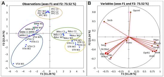 PCA plots based on covariation of genes on the basis of expression profiles of 15 CAergic and opioidergic DEGs across 30 samples, which comprise RNA-Seq FPKM data for five brain regions. (A) Active observations. W1, W2, and W3: winners; C1, C2, and C3: controls; VTA: ventral tegmental area, NAcc: nucleus accumbens, MRN: midbrain raphe nuclei, STR: dorsal striatum, and PFC: prefrontal cortex. Ovals denote brain regions. (B) Active variables. The graph illustrates distinct clustering of DEGs.