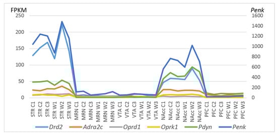 To gain further insight into CAergic–opioidergic interactions, we found the most overexpressed neuron-specific genes in the brain regions under study (Figure 7). Our genes of interest were the CA-specific Adra2c and Drd2 gene and opioid-associated genes Oprd1, Oprk1, Pdyn, and Penk for comparison, as presented in Figure 7. Both Drd2 and Penk in the STR and Penk, Pdyn, and Drd2 in the NAcc are the most highly expressed DEGs coding neuron-specific genes. These data suggest that all the main correlating events concerning the development of an addiction-like state take place in the STR and NAcc.