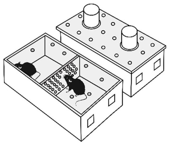 Repeated positive fighting experience, i.e., wins, in male mice were induced by daily agonistic interactions [43,44] in chronic social conflicts. Pairs of animals were each placed in a cage (28 × 14 × 10 cm) bisected by a transparent perforated partition allowing the animals to hear, see, and smell each other but preventing physical contact (Figure 8). The animals were left undisturbed for 2 days to adapt to the new housing conditions and sensory contact before they were exposed to agonistic encounters.