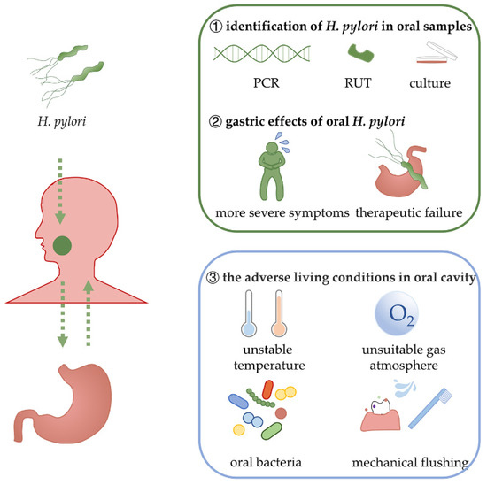 The evidence presented thus far supports the idea that H. pylori is likely to survive in the oral cavity and be involved in gastric infection. However, currently, we can only reduce the negative effects of oral H. pylori by some oral hygiene treatments. Therefore, further investigation of the details of oral H. pylori survival is required to achieve the effective eradication of H. pylori infection.