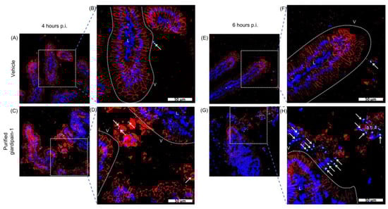 Apoptosis induction by G. duodenalis compromises the epithelial barrier []. Therefore, we evaluated the effect of giardipain-1 on the induction of apoptosis using the intestinal loop model. As shown in Figure 1, Intestinal epithelial cells (IEC) undergoing apoptosis (Green) were detected in both control and giardipain-1-treated loops. However, treatment with giardipain-1 increased the number of apoptotic cells at 6 h p.i. (Figure 1H). Most apoptotic cells detected in giardipain-1-treated duodenal loops were epithelial cells that extruded from the surface of the villi, indicating that giardipain-1 triggers not only apoptosis but also anoikis in duodenal IEC (Figure 1D,H, white arrows).