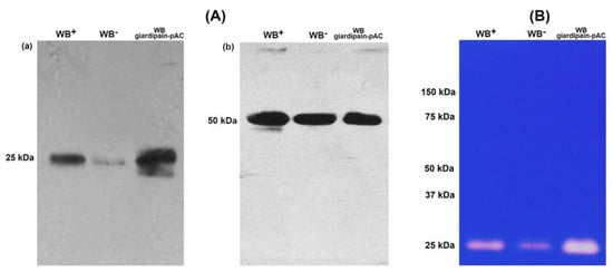 4.5. Analysis of Giardipain-1 Expression in WB Giardipain-pAC, WB+ and WB− Trophozoites by Western Blot, and Detection of Giardipain-1 Protease Activity by Zymogram Analysis