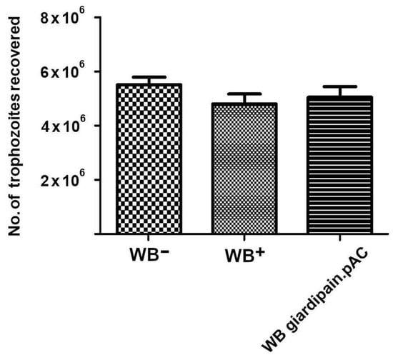 However, an assessment of trophozoite burdens in jirds showed no marked difference among the groups infected with WB giardipain-pAC, WB+ and WB− trophozoites at day 14, the time at which patency peaks in jirds [,,,] (Figure 3).