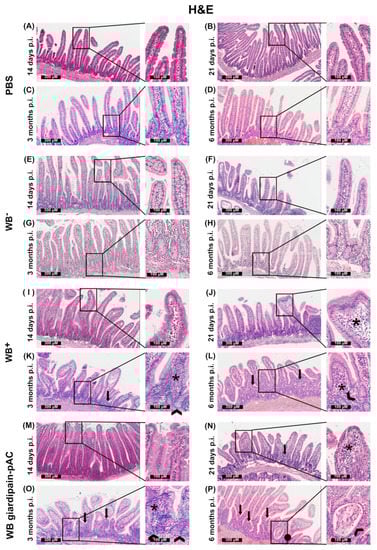 The infection of jirds with Giardia duodenalis trophozoites triggers microscopic alterations in the duodenum of these animals. Representative histological sections of the duodenum of control jirds or animals that were infected with WB−, or WB+ or WB giardipain-pAC. Time p.i. are 14 days, 21 days, 3 months and 6 months. Panels A to D are sections of control animals displaying normal mucosa with no alterations. In Panels E to H are sections of the duodenum from jirds infected with WB− trophozoites, in panels I to L are section of duodenum from jirds infected with WB+ trophozoites and in panels M to P are sections of jirds infected with WB giardipain-pAC trophozoites. Hypertrophy, shortening and fusion of villi (black arrow) as well as hyperplasia of the intestinal crypts (head arrow), oedema and inflammatory infiltrate (*) were observed in WB+ infected jirds. The alterations were more severe at 6 months p.i. WB giardipain-pAC trophozoite induced similar histopathological alterations to the ones described for WB+ trophozoites However, the changes were more severe and cryptitis (black ball) was observed at 6 months p.i. A lower number of globet cells were observed in WB− infected jirds. H&E stain, 300 μm and 100 μm scale bar.