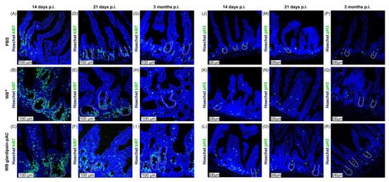 Histological damages are often related to changes in cell homeostasis. Therefore, we evaluated cell proliferation in the mucosa of jirds infected with WB+ or WB giardipain-pAC by detecting the presence of Ki67 and pHist3 []. Immunofluorescence staining of both proliferation markers was carried out in the duodenum of jirds infected with Giardia for 14 or 21 days or 3 months. As shown in Figure 5A,D,G,J,M,P, in the duodenum of control animals, Ki67 and pHist3 were detected in IEC at the crypt base, and the number of Ki67- and pHist3-positive cells remained constant, irrespective of the time at which the animal was euthanized. However, during giardiasis, Ki67-positive cells increased at the crypt base at 14 and 21 days p.i., irrespective of the line of trophozoites used (Figure 5B,C,E,F). By 3 months p.i., IEC Ki67-positive cells were only abundant in the duodenum of jirds infected with WB overexpressing giardipain-1 (Figure 5H,I). Similarly, to Ki67-positive cells, IEC pHist3-positive cells increased substantially in the duodenum of jirds infected with trophozoites at day 14 p.i., irrespective of the trophozoite line (Figure 5J–L). At 21 days or 3 months p.i., the number of pHist3-positive cells were marginally increased compared with those of control jirds (Figure 5M–R). Taken together, these results indicate that giardiasis increases proliferation of IEC.