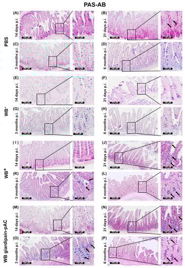 The infection of jirds with Giardia duodenalis trophozoites affects the biogenesis of goblet cells in the intestinal crypts of the duodenum in these animals. Goblet cells were identified by Alcian blue and Periodic acid–Schiff (PAS) staining of the duodenum of control jirds of animals that were infected with WB giardipain-pAC or WB+ or WB− trophozoites. Representative histological sections of the duodenum of control jirds or infected animals are included. Times p.i. are 14 days, 21 days, 3 months and 6 months. PAS-AB + IEC representing the normal population of goblet cells in intestinal villi is observed in the control animals (A–D). PAS-AB + IEC increased in sections of the duodenum of the group infected with trophozoites. Panels are as follows: WB- trophozoites (E) 14 days p.i. (F) 21 days p.i. (G) 3 months p.i. (H) 6 months p.i. WB+ (I) 14 days p.i. (J) 21 days p.i. (K) 3 months p.i. (L) 6 months p.i. and WB giardipain-pAC trophozoites (M) 14 days p.i. (N) 21 days p.i. (O) 3 months p.i. (P) 6 months p.i. At 14 and 21 days, goblet cells were detected in the crypt base. At 3 and 6 months, goblet cells were observed along the whole crypt-villus axis. A lower number of globet cells were observed in WB− infected jirds. AB+ cells = blue color. PAS+ = purple color. Arrows indicate positively stained goblet cells.