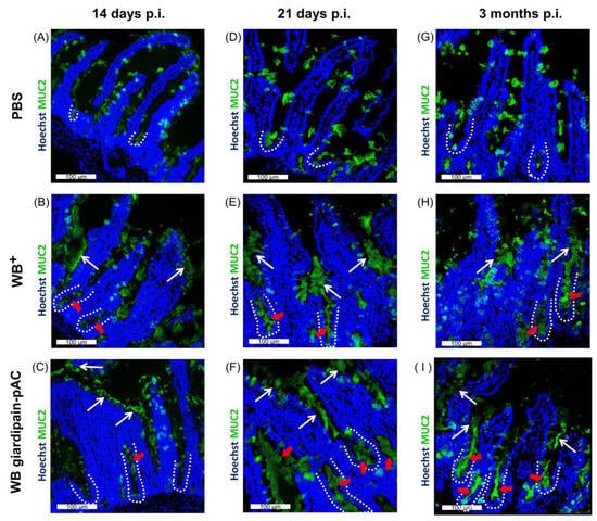 MUC2 is increased in the duodenum of jirds infected with Giardia duodenalis trophozoites. Mucin 2 (MUC2) was detected by immunofluorescence staining of the duodenum of jirds that were infected with WB giardipain-pAC or WB+ trophozoites. Representative histological sections of the duodenum of control jirds or infected animals are included. Panels are as follows, sections from: (A) control animals (B) animals infected with WB+ trophozoites (C) animals infected with WB giardipain-pAC trophozoites at 14 days p.i. (D) control animals (E) animals infected with WB+ trophozoites (F) animals infected with WB giardipain-pAC trophozoites, at 21 days p.i. (G) control animals (H) animals infected with WB+ trophozoites (I), animals infected with WB giardipain-pAC trophozoites, at 3 months p.i. MUC2 = Green. Nuclei = blue. Dashed line marks the crypt border. White arrow indicates secreted MUC2. Red arrow = indicates intracellular accumulation of MUC2. Scale bar = 100 μm.
