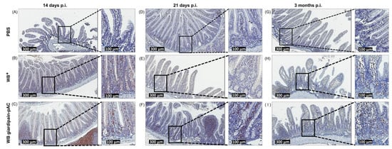 The infection of jirds with Giardia duodenalis trophozoites triggers the recruitment of CD3+ at the duodenum of jirds. CD3+ cells were determined by immunohistochemistry in histological sections of the duodenum of jirds that were infected with WB giardipain-pAC or WB+ trophozoites. Representative histological sections of the duodenum of control jirds or infected animals are included. Panels are identified as follows, sections from: (A) control animals, (B) animals infected with WB+ trophozoites, (C) animals infected with WB giardipain-pAC trophozoites at 14 days p.i. (D) control animals (E) animals infected with WB+ trophozoites (F) animals infected with WB giardipain-pAc trophozoites at 21 days p.i. (G) control animals (H) animals infected with WB+ trophozoites. (I) jirds infected with WB giardipain-pAc trophozoites at 3 months p.i. CD3+ cells are stained in brown. Scale bar = 300 μm and 100 μM.