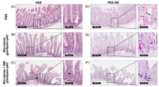 Microscopic alterations in sections of the duodenum of the animals treated with fecotransplants, then infected with WB giardipain-pAC trophozoites and euthanized at 21 days p.i. Representative histological and histochemistry sections of the duodenum of jirds that received the microbiota of previously infected jirds and then were infected with WB giardipain-pAC. Sections are from: (A) control animals displaying normal mucosa with no alterations. (B) jirds given microbiota from animals infected with WB giardipain-pAC trophozoites; in these animals slight thickening of villi was observed, (C) animals that received microbiota and that were infected with WB giardipain-pAC. In these atrophy, fusion of villi (red arrow) as well as hyperplasia of the intestinal crypts (head arrow) and inflammatory infiltrate (*) were observed by H&E stain, 300 μm and 100 scale bar. PAS-AB+ stained of sections from: (D) control animals in which the normal population of goblet cells in intestinal villi was observed. (E) jirds that were given microbiota from animals previously infected with WB giardipain-pAC trophozoites; in these sections a slight increase in goblet cells was observed and (F) animals given microbiota and then infected with WB giardipain-pAC. In these a marked increase in goblet cells was observed = arrow. Scale bar = 300 μm and 100 μM.