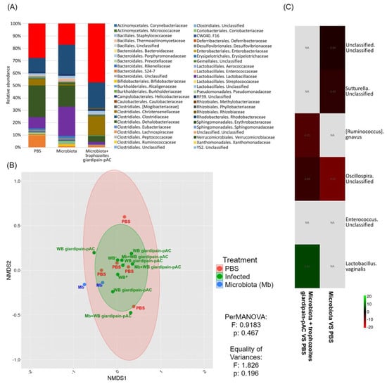 Determination of changes in the microbiota (Mb) composition of jirds that received different treatments and were euthanized at 21 days p.i. Composition of the microbiota in jird feces that received different treatments was determined by 16S ribosomal RNA gene amplicon sequencing. The data were compared between the control group (PBS) and the group of animals that was given microbiota from giardipain-pAC infected animals and then were infected with WB giardipain-pAC trophozoites. (A) Average relative microbial abundance at the family levels in the different groups. (B) Variation in beta-diversity of jird gut bacterial communities based on Bray–Curtis dissimilarities. (C) Heat map for relative abundance at species level with significant changes.