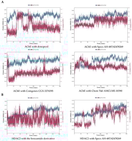 Calculated RMSDs (Å) of the displacements of the protein-ligand complexes over the MD simulation time: (A) AChE with reference ligand/hit ligands; (B) HDAC2 with reference ligand/hit ligands; (C) MAO-B with reference ligand/hit ligands.