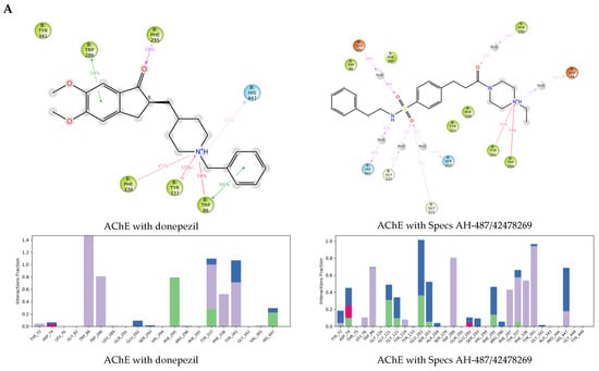 For the complex of AChE with donepezil Trp86, Trp286, Phe295, Tyr337, Phe338, Tyr341, and His447 were shown to participate in the PLIs. Trp86, Trp286, and Phe295 were also outlined in the analysis of the PLIs of the co-crystalized reference ligands (Figure 3). The interactions with the three selected hits involved more protein residues, including the above residues, and other residues with longer interaction times, i.e., Glu202 for Specs AH-487/42478269, Tyr133 for Comgenex CGX-3274395, Asp74 and Tyr124 for Chem T&I AMCLME-10390.