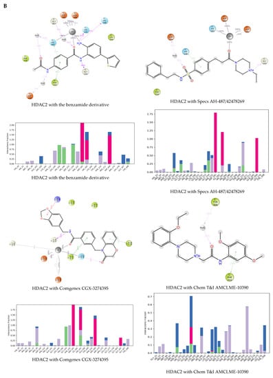 For the interaction of benzamide derivative with HDAC2 residues Asp104, Leu144, His145, His146, Gly154, Phe155, Asp181, His183, Phe210, Asp269, Gly307 and Tyr308 were outlined. Metal coordination interactions with Zn2+ involving Asp181, His183 and Asp269 were maintained during 100% of the simulation time. In the docking analysis Gly154, Asp181, and Tyr308 were shown to interact with the ligand (Figure 3). Some of the above residues took part in the interactions of Comgenex CGX-3274395 with HDAC2—Leu144, Gly154, Phe155, Asp181, His183, Phe210, Asp269, and Tyr308, including also interactions with Arg39 and Gly305. This complex showed to be stable by the RMSD values. Some of the above residues participated in the interactions of the complex of HDAC2 with Specs AH-487/42478269—Asp104, His146, Gly154, Phe155, Asp181, His183, Phe210, Asp269, including also Gly143. However, apart from the metal coordination with Zn2+ and the interaction with Phe210 (hydrophobic and H-bonding), the other interactions were present in less than 50% of the simulation time, which may explain the lower stability of the complex. For the complex of HDAC2 with Chem T&I AMCLME-10390 shown by the RMSD values also to be less stable, no PLIs were taking place during the whole period of the simulation—the interactions with the residues Asn100, His146, Glu151, Ala152, Phe155, His183, Phe210 and Tyr308 were present during or less than 50% of the simulation time, the interactions with Asp104 (hydrophobic, ionic, water bridge) were present around 70% of the simulation time. No metal coordination with Zn2+ was observed for this complex.