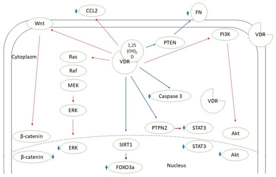 Known pathways mediating vitamin D action in thyroid cancer cells. CCL2—C-C motif chemokine ligand 2; ERK—extracellular signal-regulated kinase; FN—fibronectin; FOXO3a—forkhead box protein O3a; MEK—mitogen-activated protein kinase kinase 1; PI3K—phosphoinositide 3-kinase; PTEN—phosphatase and tensin homolog; PTPN2—protein tyrosine phosphatase N 2; SIRT1—sirtuin 1 histon deacethylase; STAT3—signal transducer and activator of transcription 3; VDR—vitamin D receptor. Red lines—inhibition; blue lines—stimulation.