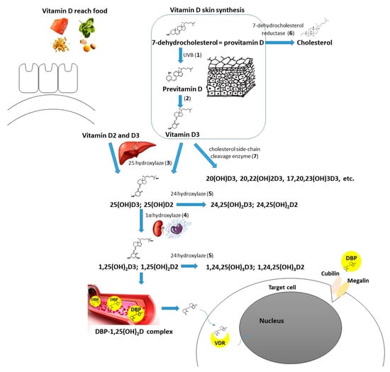 Vitamin D metabolism (including molecules/enzymes involved, coding genes in brackets): Cubilin (CUBN); DBP—vitamin D binding protein (GC); Megalin (LRP2); VDR—vitamin D receptor (VDR); 1—UVB radiation, 290–315 mm wavelength; 2—nonenzymatic isomerization reaction under the temperature; 3—25-hydroxylase (main enzyme—CYP2R1—cytochrome P450 family 2 subfamily R member 1, minor role of CYP27A1—cytochrome P450 family 27 subfamily A member 1); 4—1α-hydroxylase (CYP27B1—cytochrome P450 family 27 subfamily B member 1); 5—24-hydroxylase (CYP24A1—cytochrome P450 family 24 subfamily A member 1); 6—7-dehydrocholesterol reductase (DHCR7); 7—cholesterol side-chain cleavage enzyme (CYP11A1—cytochrome P450 family 11 subfamily A member 1).