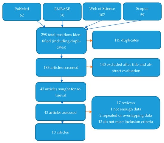 Figure 3 shows the flow diagram depicting the process of selecting studies for systematic review and the search strategy. A total of 298 items were found after a search of four databases. In all, 115 of these items were excluded as duplicates. After assessing their titles and abstracts, a further 140 articles were excluded as inaccurate/unrelated to the subject of the study. Finally, 43 articles were fully reviewed for eligibility. Of these, 33 were excluded for different reasons, as shown in Figure 3. Ten studies met the inclusion criteria and are presented below [,,,,,,,,,].