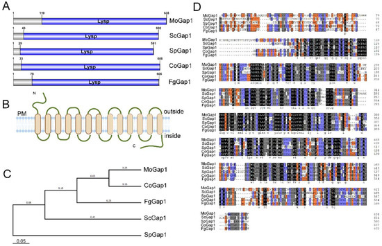 Identification of MoGap1 in M. oryzae. (A) Gap1 proteins of M. oryzae, S. cerevisiae, S. pombe, C. truncatum, and F. graminearum shown using IBS 1.0 software. Lysp: amino acid permease domain. (B) Schematic diagram of a Gap1 protein that contained 13 transmembrane regions. (C) Phylogenetic trees of the Gap1 proteins constructed using MEGA 7.0. (D) Multiple sequence alignment shown using DNAMAN software.