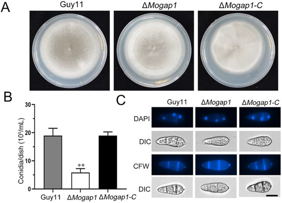 Colony morphology and sporulation of M. oryzae. (A) Colony morphology of Guy11, ΔMogap1, and ΔMogap1-C after 9 days of culture. (B) The conidia of Guy11, ΔMogap1, and ΔMogap1-C stained using DAPI and CFW on a scale of 10 μm. (C) Relative spore formation of Guy11, ΔMogap1, and ΔMogap1-C after 9 days of culture, the first of which differed significantly from the others. ** p < 0.01.