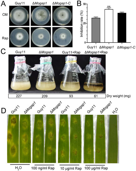 MoGap1 responses to rapamycin stress. (A) The growth of Guy11, ΔMogap1, and ΔMogap1-C for 8 days of culture on CM and Rap for 8 days, respectively. (B) The inhibition rates of rapamycin in Guy11, ΔMogap1, and ΔMogap1-C calculated by measuring the growth diameters, which were significantly different between MoGap1 and Guy11 (** p < 0.01). (C) The growth rate was observed in CM liquid medium. The dry weights of Guy11 and ΔMogap1 were calculated after being cultured in CM liquid medium for 2 days. (D) Virulence detection in ΔMogap1 mutant. The conidia (1 × 105 spores/mL) were incubated on 2-week-old barley and cultured at 25 °C for 4 days.