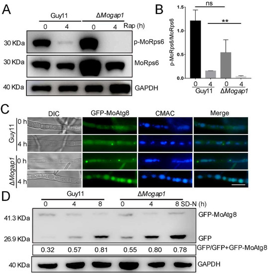 MoGap1 negatively regulates autophagy. (A) MoRps6 phosphorylation levels of Guy11 and ΔMogap1 after 0 h and 4 h of 30 ng/mL rapamycin induction with GAPDH as internal reference. (B) The phosphorylation levels of MoRps6 were calculated and graphed using Prism 7.0 software (t-test; ns: no significant, ** p < 0.01). (C) Autophagy flux was observed in the wild-type Guy11 and ΔMogap1 strain in CM and starvation conditions. Bar = 10 μm. (D) Expression levels of GFP-MoAtg8 and GFP in Guy11 and ΔMogap1, respectively, after SD-N starvation with GAPDH as internal reference.