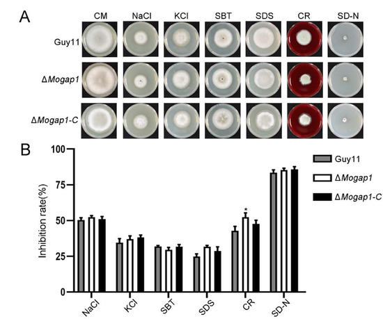 Effect of MoGap1 on CWI. (A) The growth performance of Guy11, ΔMogap1, and ΔMogap1-C under hypertonic stress (NaCl medium, KCl medium, and SBT medium), cell wall stress (SDS medium and CR medium), or starvation stress (SD-N medium). (B) The inhibition rates of Guy11, ΔMogap1, and ΔMogap1-C in different stress media, in which those between ΔMogap1 by CR and Guy11 were significantly different (* p < 0.05).