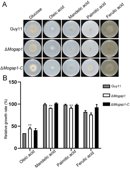 Utilization of different carbon sources in ΔMogap1. (A) The growth of Guy11, ΔMogap1, and ΔMogap1-C with different C sources. (B) The relative growth rates of Guy11, ΔMogap1, and ΔMogap1-C with different C sources. With oleic acid, mandelic acid, or palmitic acid as the C source, the relative growth rates of Guy11 and ΔMogap1 were significantly different from each other. ** p < 0.01.