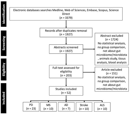 Modifications of the compositions of the gut microbiota have been identified in numerous pathologies and the different potential mechanisms of action have been described in a significant number of narrative reviews mostly focusing on Alzheimer’s disease (AD) [,,,,,], Parkinson’s disease (PD) [,,,,,,], and multiple sclerosis (MS) [,,,]. Changes in the gut microbiota have also been found in stroke [,] and amyotrophic lateral sclerosis (ALS) [,].