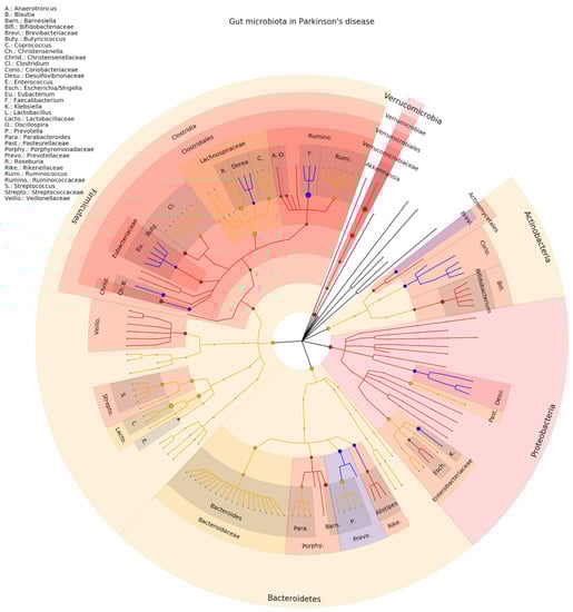 Phylogenetic distributions of the microbiota involved in Parkinson’s. Orange indicates inconsistent results, blue indicates a decrease in relative abundance, and red indicates an increase in relative abundance. These results are the summary of consistent findings of the included studies [,,,,,,,,,,,,,,,,,,,,,,].