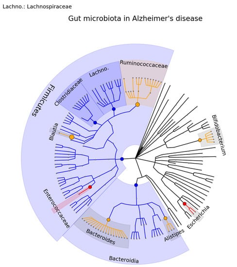 Phylogenetic distributions of the microbiota involved in Alzheimer’s disease. Orange indicates inconsistent results, blue indicates a decrease in relative abundance, and red indicates an increase in relative abundance. These results are the summary of consistent findings of the included studies [,,,,,,].