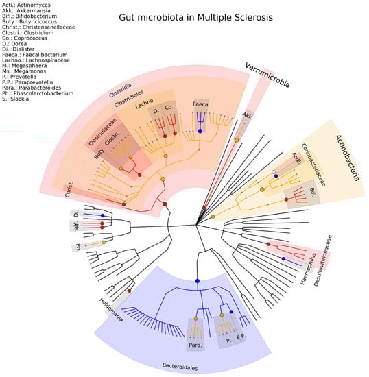 Phylogenetic distributions of the microbiota involved in multiple sclerosis. Orange indicates inconsistent results, blue indicates a decrease in relative abundance, and red indicates an increase in relative abundance. These results are the summary of consistent findings of the included studies [,,,,,,,,,].