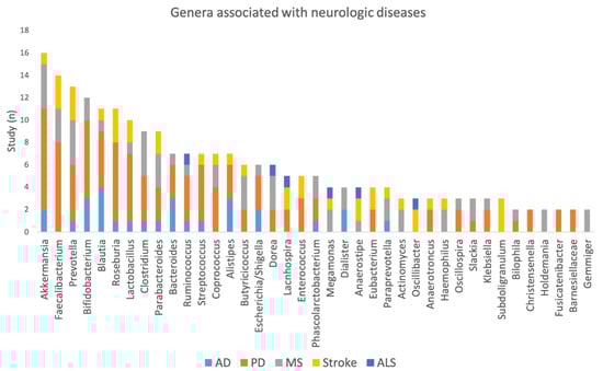 The past decade has seen a rapid rise in studies of the role of microbiota in various disorders. In this review, we focus on the consistency of the direction of the relationship found within neurological diseases and between neurologic diseases including PD, AD, ALS, MS, and stroke. The disease with the most consistent microbiome associations is PD. The findings are most reliable as they are based on the largest samples size. Amongst the microbiota associated most frequently, a clear pattern was observed for the genus Akkermansia which showed a consistent increase in nine studies in PD [,,,,,,,,] and four in MS [,,,]. Akkermansia resides in the mucus layer of the large intestine [], where they are involved in maintaining intestinal integrity and mucin degradation []. Akkermansia uses mucins as a carbon source [] and can cleave sialic acids []. As shown in Figure 2, the increase in the relative abundance of Akkermansia in PD is confirmed at all the taxonomic levels presenting a strong signature of the disease. Such consistency along all the taxonomic levels was not seen for any other microbiota for the other diseases studied. Akkermansia can stimulate dendritic cells to produce TGFβ and interleukin 6 (IL6) and 1 (IL1), activating regulatory T Cells (Tregs) which may be relevant for the pathogenesis of MS as well as for PD []. Changes in the gut microbiota have been linked with an increase in inflammation in the central nervous system in various neurological diseases. Our first line of defense is the innate immune system, which consists of physical and chemical barriers, immune cells, and blood proteins (such as cytokines). Toll-like receptors (TLRs) located on the membranes of epithelial and lymphoid cells in the small intestine mediate this differential recognition of commensal and pathogenic bacteria []. The question to answer is how to interpret the change in Akkermansia seen in both disorders. MS is primarily a neuroinflammatory disorder and there is increasing interest in the role of neuroinflammation in PD as a therapeutic target [,,]. A late complication of MS and PD is cognitive decline and there is increasing evidence that neuroinflammation is involved in dementia and cognitive decline. In this study, the evidence for the role of Akkermansia in dementia was not consistent. However, a problem interpreting the findings of the AD studies is that the power of these studies has been low and false negative findings may be frequent. Akkermansia have been associated with diabetes and cardiovascular disease, co-morbidity of which are often seen in neurodegenerative disorders. Recently, Akkermansia intervention has been approved by the European Food Safe authority []. Last but not least, the abundance of Akkermansia has also been associated with constipation, which is often seen in PD patients and is a major clinical problem []. Of note is that constipation is very common in MS patients and a hypothesis to be tested is whether this problem in MS is related to the increased abundance of Akkermansia in the gut.