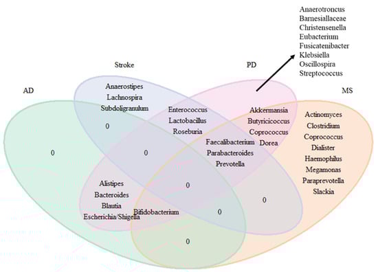 Venn diagram for the genera consistently found in the literature for neurodegenerative and neurological diseases.