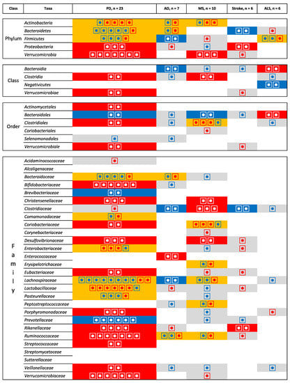 Microbiota that have been identified in at least two studies for the same pathologies at the phylum, class, order and family levels. Grey is used for one study, orange indicates inconsistent results, blue indicates a decrease in relative abundance, and red indicates an increase in relative abundance. The numbers of the circle indicate the number of studies that identify the microbiota and the direction of the inconsistencies.