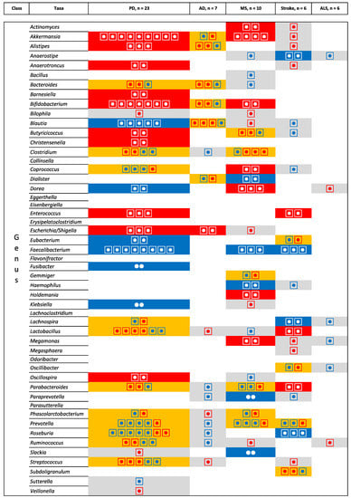 AD and PD are the two most common neurodegenerative diseases in the elderly. Of note is that each of the microbiota that are consistently associated to AD are also consistently associated to PD. At the genus level, for AD and PD, changes of Alistipes, Bacteroides, Bifidobacterium, and Escherichia/Shigella are found in the same direction (an increase of relative abundance) while the opposite direction is found for Blautia (relative increase in AD but decrease in PD). Alistipes and Bacteroides have been implicated in cholesterol homeostasis. Escherichia coli has been implicated in amyloid (AD) and alpha-synuclein (PD) metabolism as well as gliosis (seen both in AD and PD []).