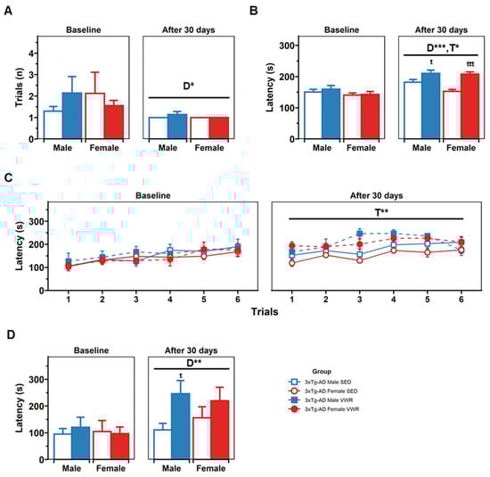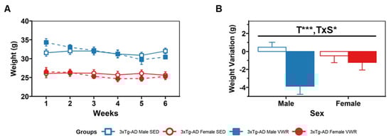 We have previously shown that at advanced stages of the disease, mortality rates are higher in 3xTg-AD males []. In the present work, sexual differences were also found with survival in all 17 females but mortality in 5 of the 22 males. In addition, the VWR male group showed a higher mortality ratio than the SED male group, albeit it did not reach statistical significance. This would agree with a previous work at the same stage of the disease, where only females survived in a VWR protocol, whereas NTg and 3xTg-AD males did not [].
