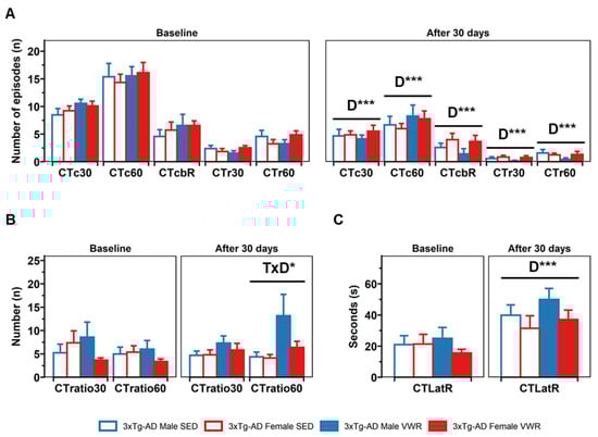 In our previous longitudinal study [], including mice at 12 and 16 months of age at normal and AD-pathological stages, we found a reduction in the CTratio60 with age. Now, an increment in the CTratio60 was observed in the VWR group. We believe the increment was due to a general reduction in the CTrearings episodes, more than the potential beneficial effects of exercise. Thus, in experiments carried out in mice at earlier stages of AD [], four weeks of voluntary running did not attenuate the reduction of horizontal (CTc60) or vertical activity (CTr60) in the test.